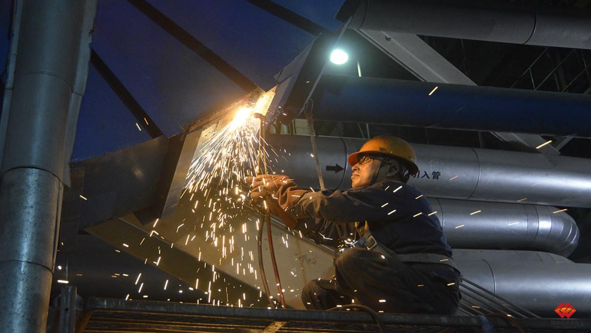 图为该厂锅炉焊工加紧进行一次风箱的恢复性焊接。