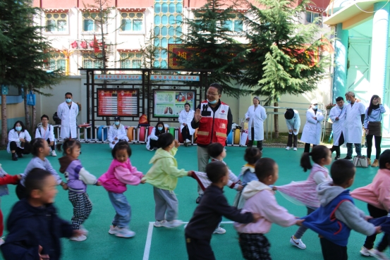 做完筛查的德钦县幼儿园小朋友们向乡村医生和志愿者打招呼