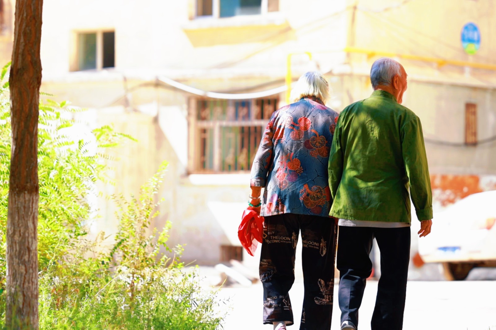 图为活动结束后两位老人相偎蹒跚在回家的路上
