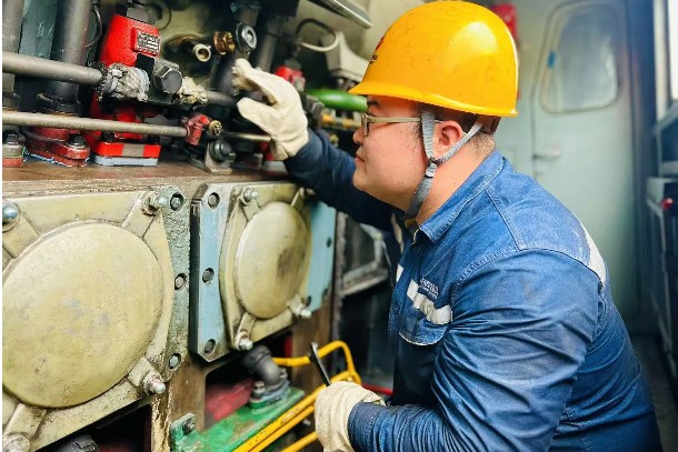 “小张,拿扭矩扳手来!今天得把16个喷油器全拆检一遍,高温天雾化不良容易拉缸!”58岁的老师傅钞利生蹲在柴油机旁,声音带着一丝沙哑。他戴着厚厚的手套,手指却依旧灵活,深色的汗渍顺着脸颊往下淌,工装后背早已被汗水浸透,裤腰处也积了一圈湿痕。