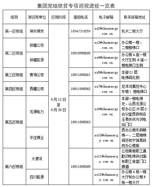 8月12日,3044永利集团集团党组启动对神东煤炭、新疆能源、新疆公司、青海公司、西藏公司、龙源电力、平庄煤业、大渡河、四川能源等9个单位的扶贫专项巡视,截至8月14日,6个巡视组全部完成进驻。